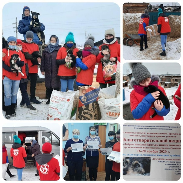 Акция «Добрые посылки братьям нашим меньшим»Проблема бездомных животных актуальна всегда и носит глобальный характер. Волонтеры отряда « Позитив» ОГКУСО «Центр помощи детям, оставшимся без попечения родителей, г. Тулуна» не смогли остаться в стороне.