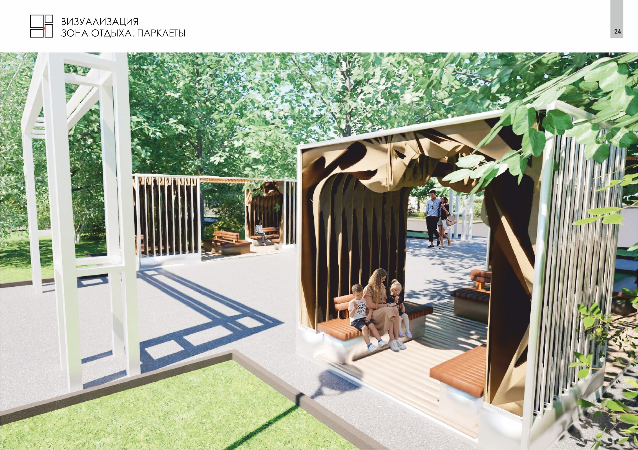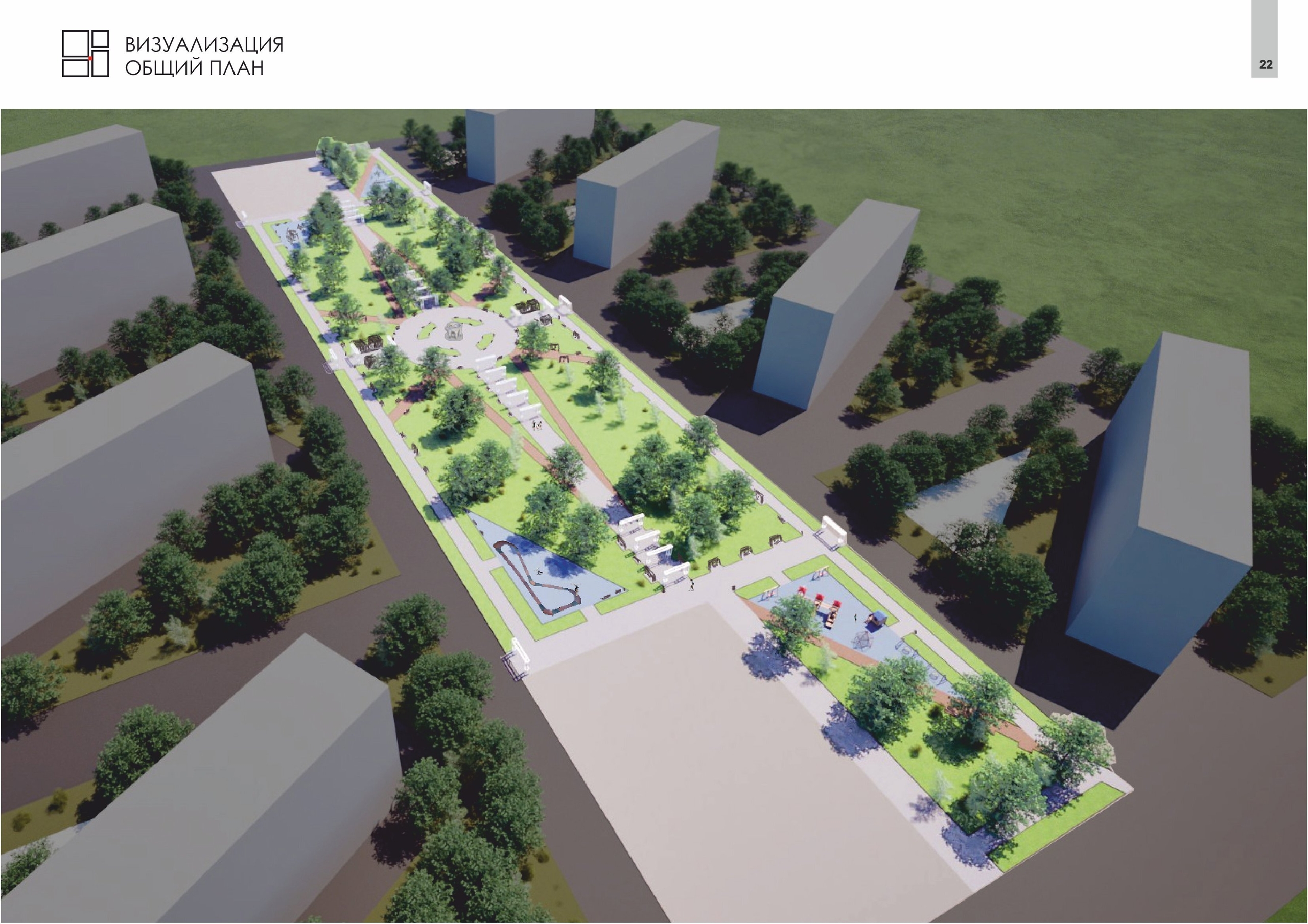 Проект предлагает организовать пешеходные связи, зоны отдыха с лавочками, малыми архитектурными формами для отдыха и проведения мероприятий, игровых зон для детей и спортивных площадок для взрослых. При разработке проекта учитывались потребности маломобильных групп населения, а также были подобраны МАФы из экологически чистых материалов.