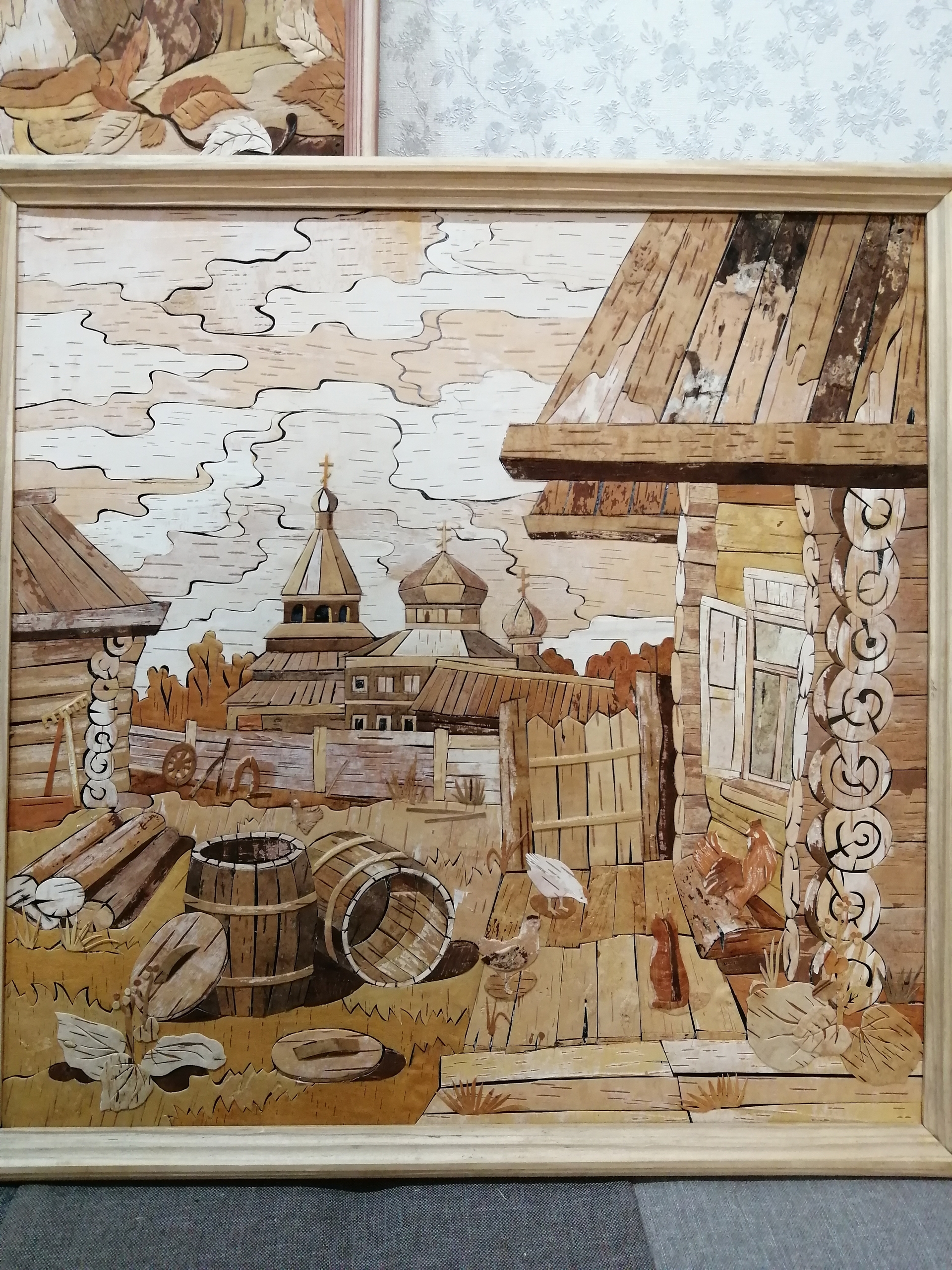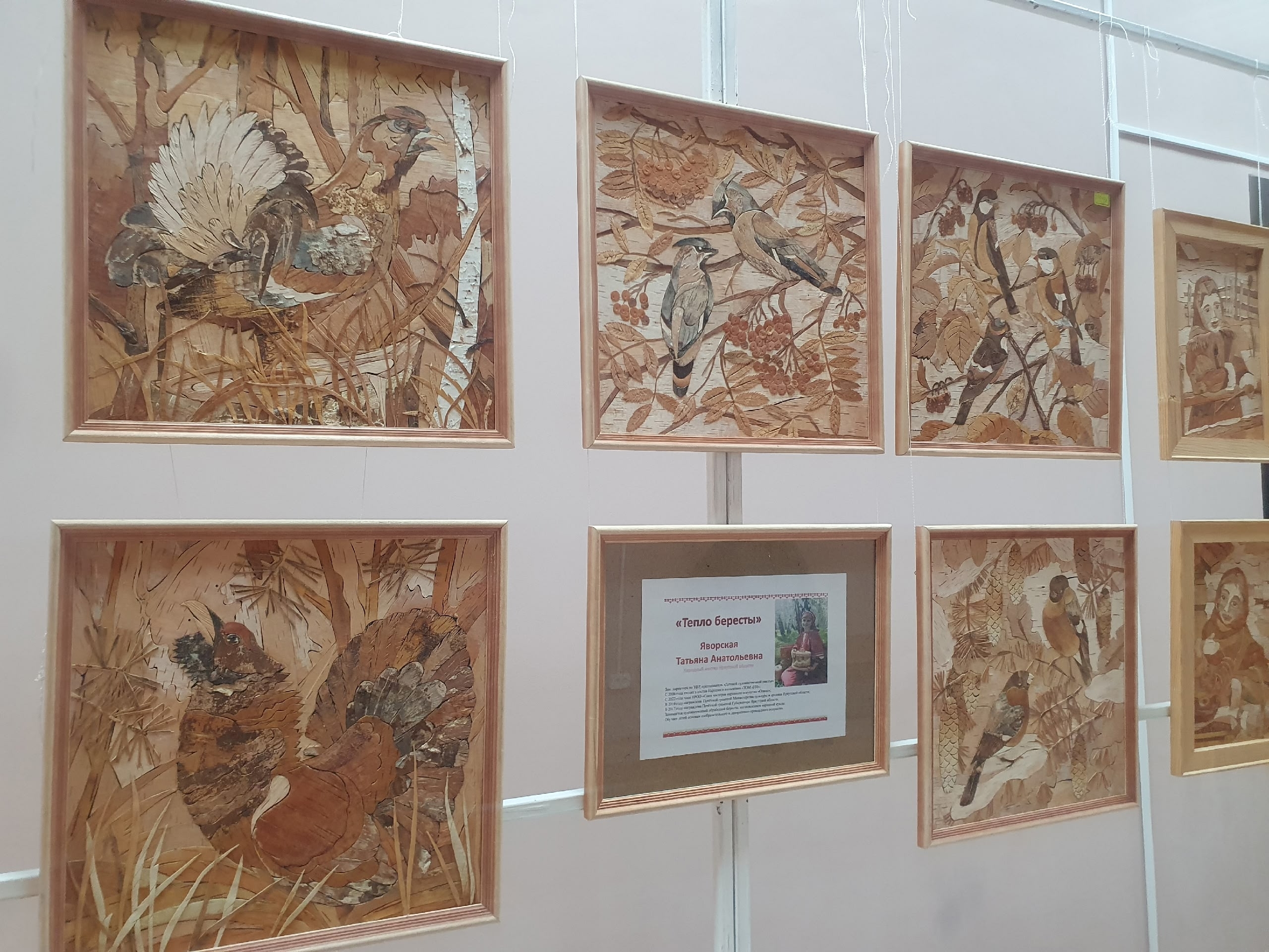 На экспозиции — берестяные картины с пейзажами и птицами, выполненные из натуральной бересты без красок, с бережным вниманием к каждой детали ✨