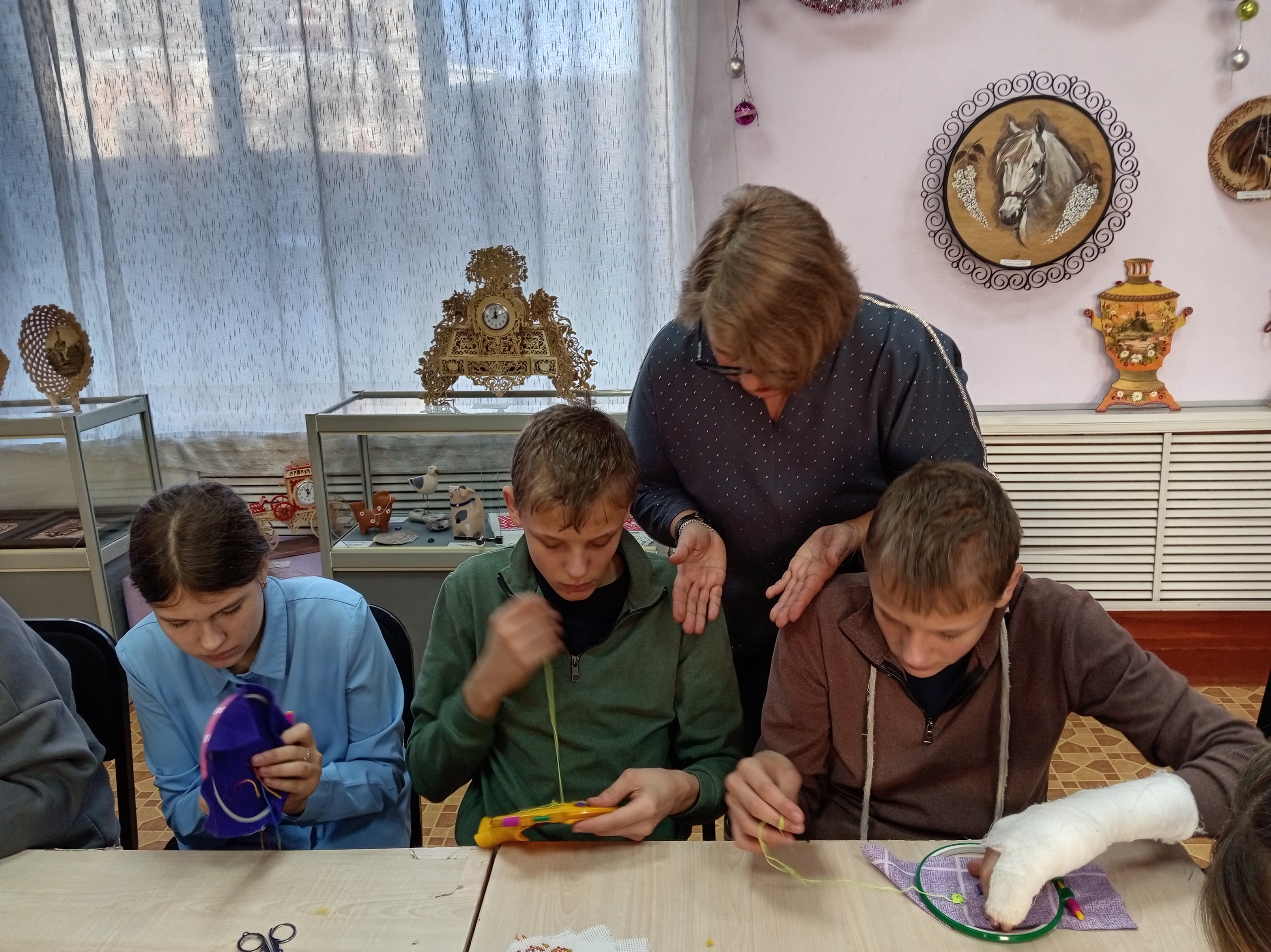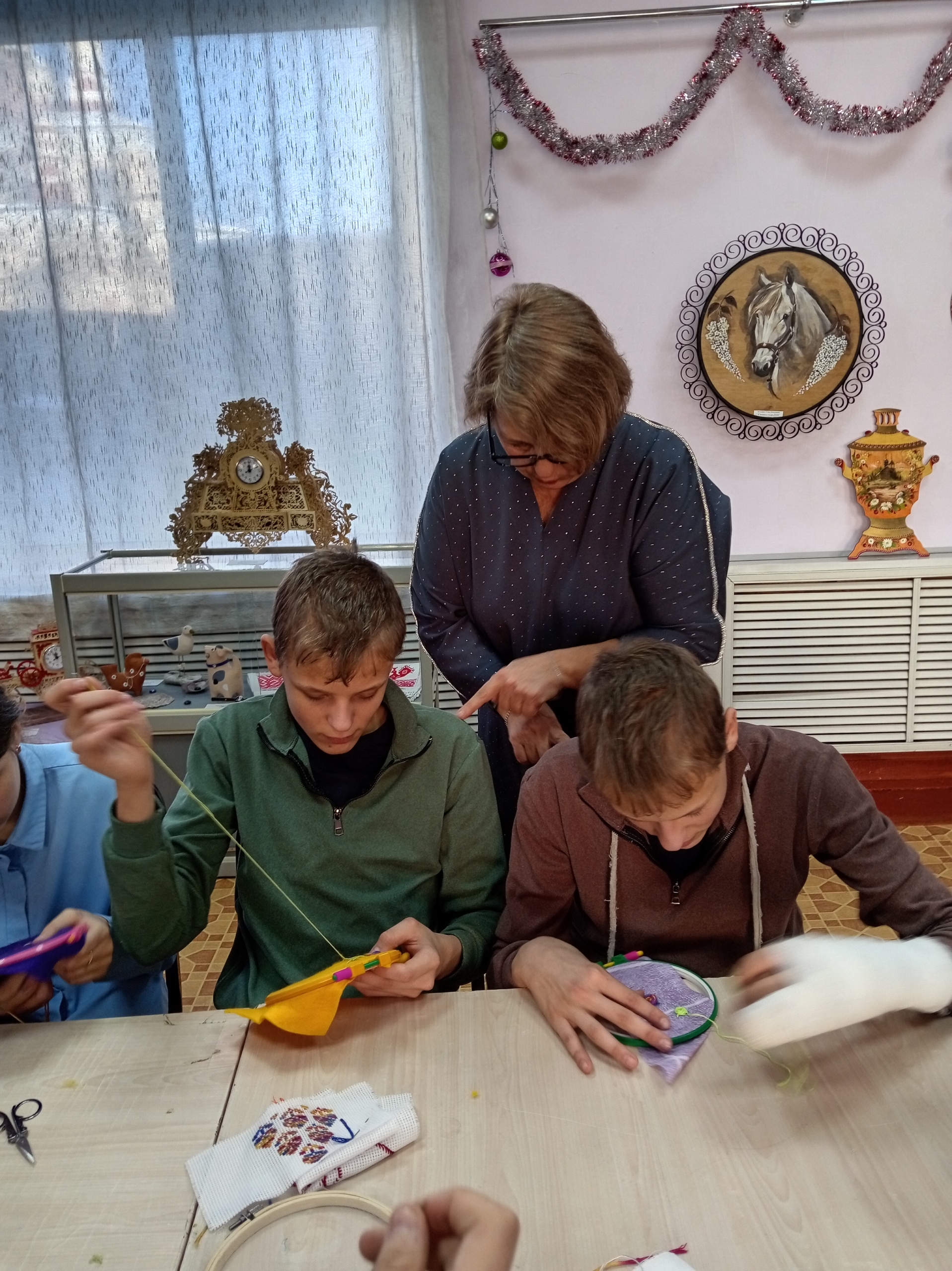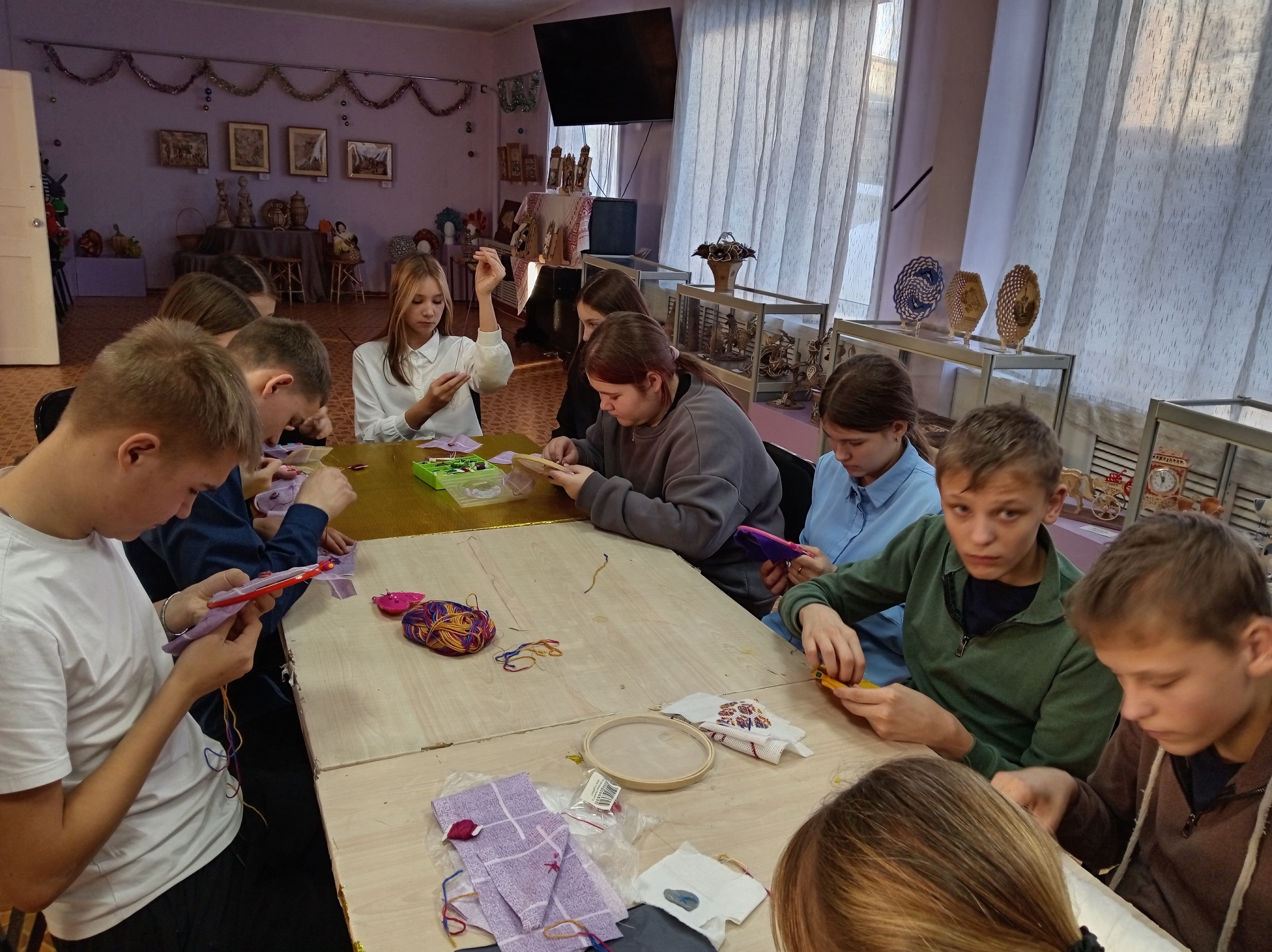 В преддверии новогодних праздников в выставочном зале краеведческого музея прошло интереснейшее занятие. Мастер преподаватель Толстошеева Елена Викторовна для ребят из СОШ № 8 п. Писарево провела интерактивный мастер класс по созданию объёмной вышивки.