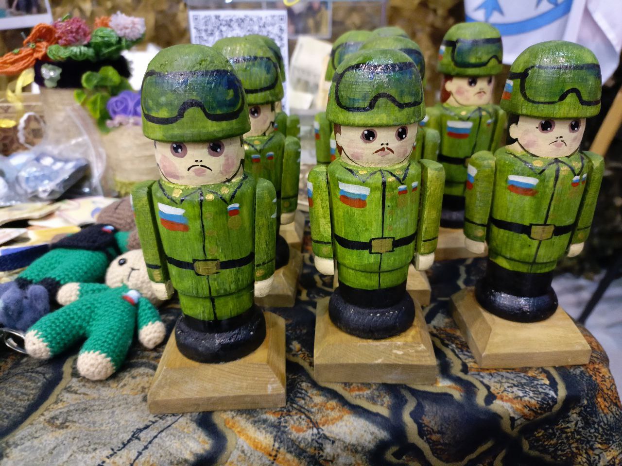 Волонтерская группа из города Зимы «Зима-сила» принимала участие и в первом региональном форуме, и во втором, присутствует и сейчас. Лидер группы Ирина Шульгина рассказывает: «Мы привезли на выставку то, что производим и отправляем на передовую. Это маскировочные сети, флисовые костюмы, антидроновые одеяла. Нынче мы стали разрабатывать носилки-волокуши для эвакуации раненых, и тоже уже отправляем с гуманитарным грузом. А наш дом ремесел делает вот таких солдатиков и другие поделки».