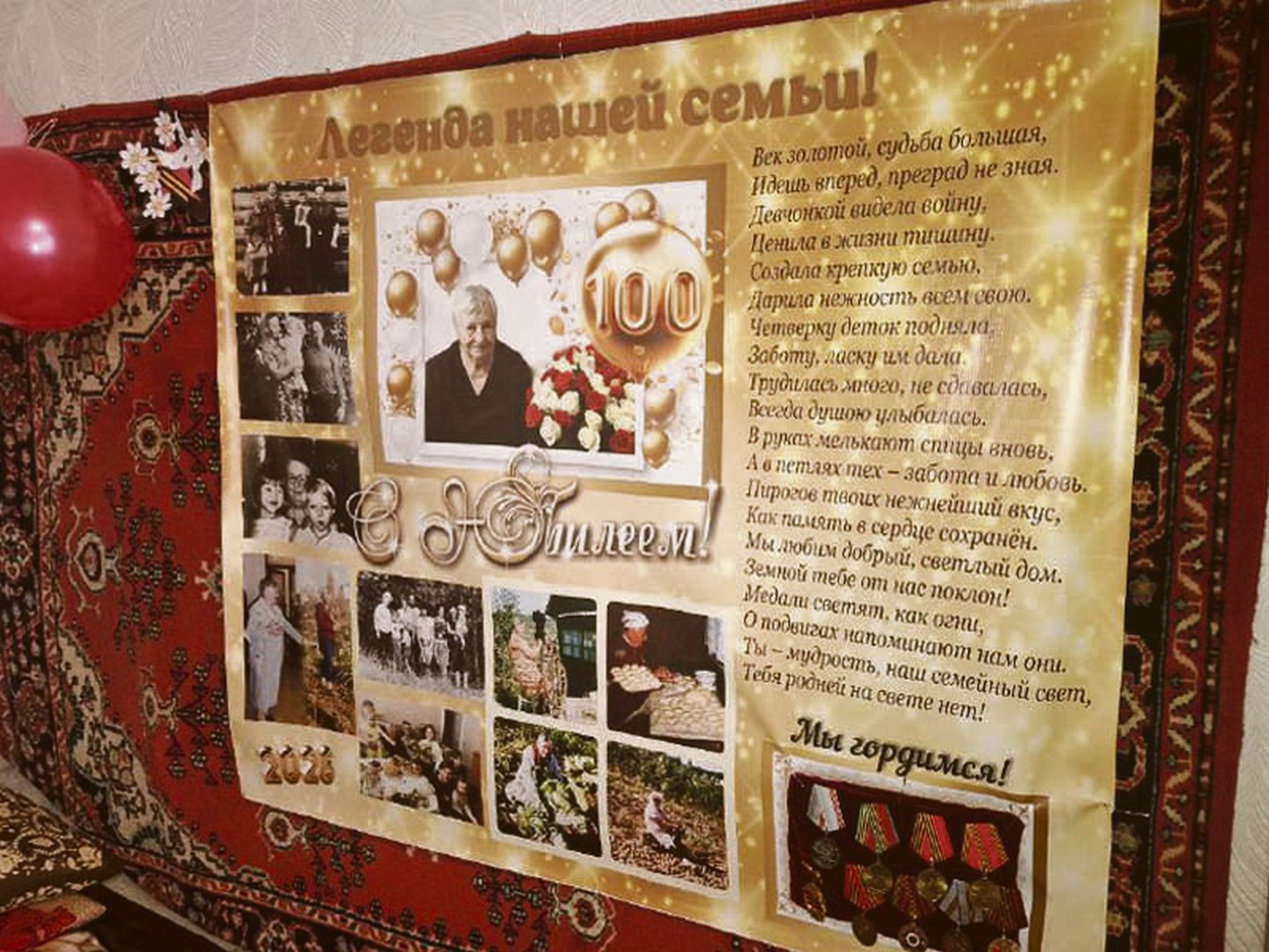 К юбилею Лидии Макаровны ее родные подготовили большой плакат на баннерной ткани: в центре — именинница с большим букетом цветов, справа — длинное стихотворение с главными фактами о жизни, а вокруг множество фотографий. Самые ранние — черно-белые, где Лидия еще совсем молодая; снимки с мужем, детьми, внуками, на даче, за приготовлением пирожков, за настоящей прялкой — с деревянным колесом и веретеном