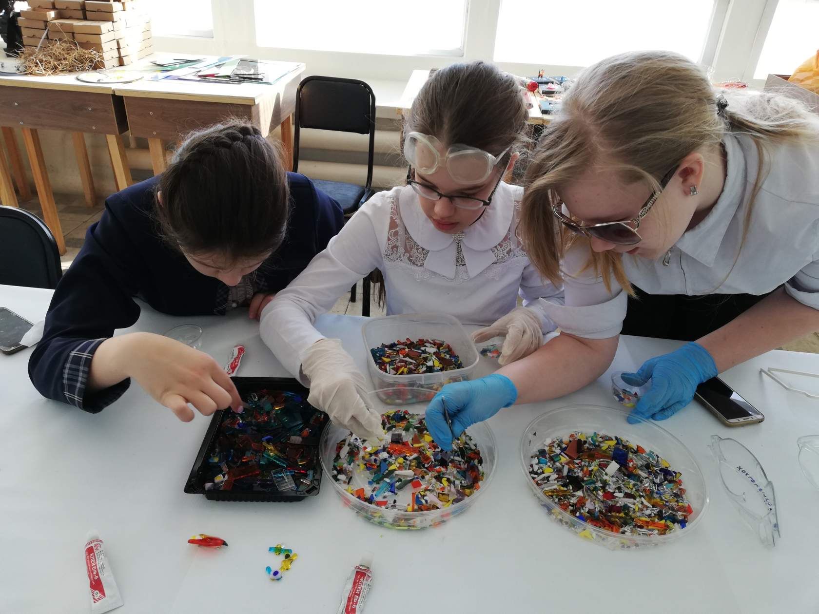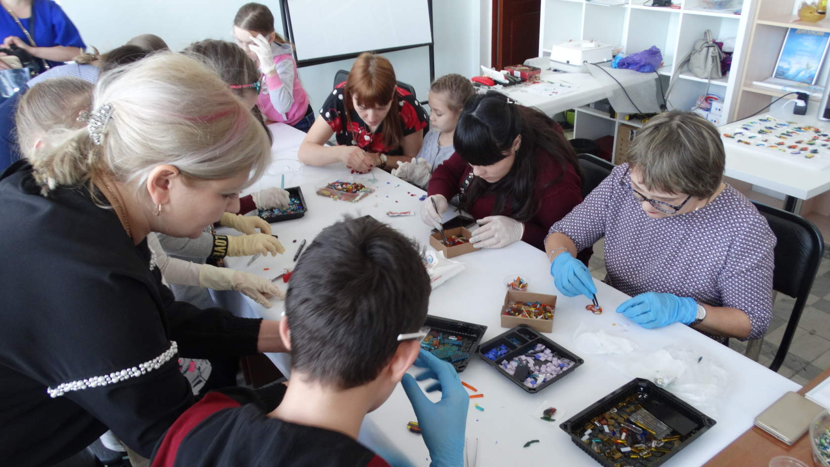 Она же выполнила подготовительные этапы работы, включающие нарезку и шлифовку стекла. Участники мастер-классов выбирали уже готовые основы для своих брошей или кулонов. После краткой лекции о технике безопасности и основных этапах работы, составляющих технику «фьюзинг», начиналась непосредственно сама ювелирная работа по составлению волшебных композиций из стекла. Как это происходит? – Сначала придумывается композиция, потом подбираются подходящие кусочки стекла и приклеиваются на основу клеем. Это очень увлекательное творческое занятие, в которое с головой погружаются все участники мастер-классов.
