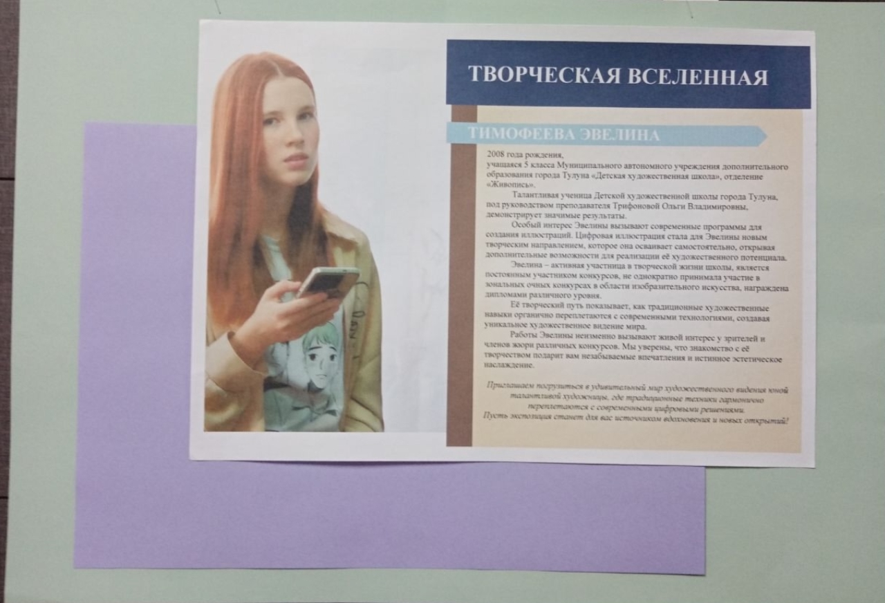 Под чутким руководством опытного педагога Ольги Трифоновой Эвелина уверенно идёт по творческому пути, достигая значимых результатов. Благодаря своему таланту и усердию девочка создаёт уникальные произведения искусства, которые вызывают восхищение зрителей.