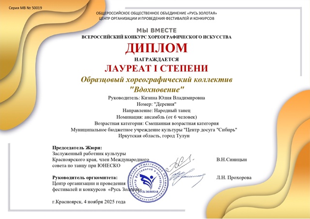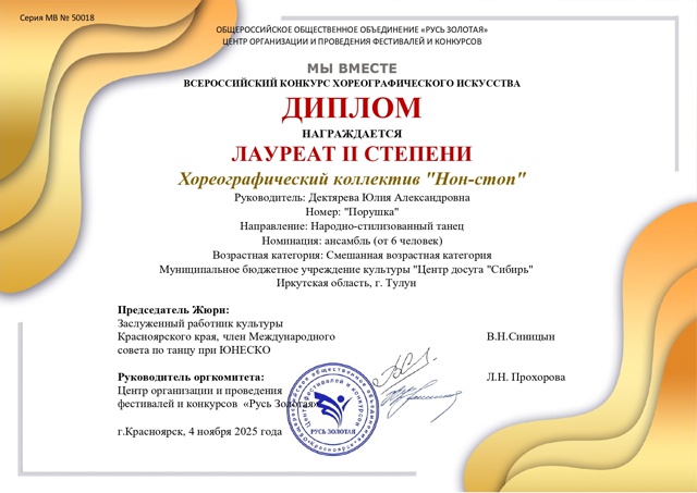 💥 Центр Досуга «Сибирь» с гордостью делится блестящими результатами участия наших коллективов во Всероссийском конкурсе хореографического искусства «Мы вместе»! Это настоящий триумф таланта, трудолюбия и профессионализма.