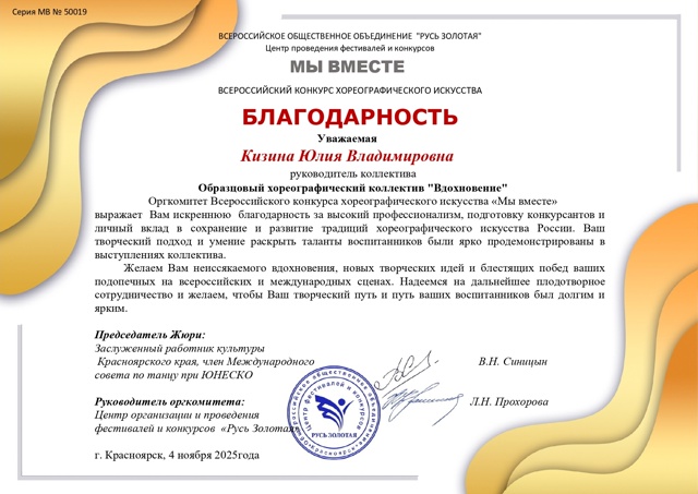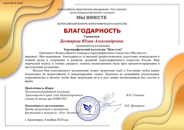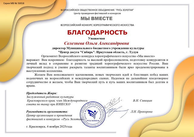 💥 Особые поздравления заслуживают наши педагоги и директор Центра Досуга «Сибирь» Ольга Александровна Селезнева, получившие благодарность за высокий профессионализм, подготовку конкурсантов и личный вклад в сохранение и развитие традиций хореографического искусства.