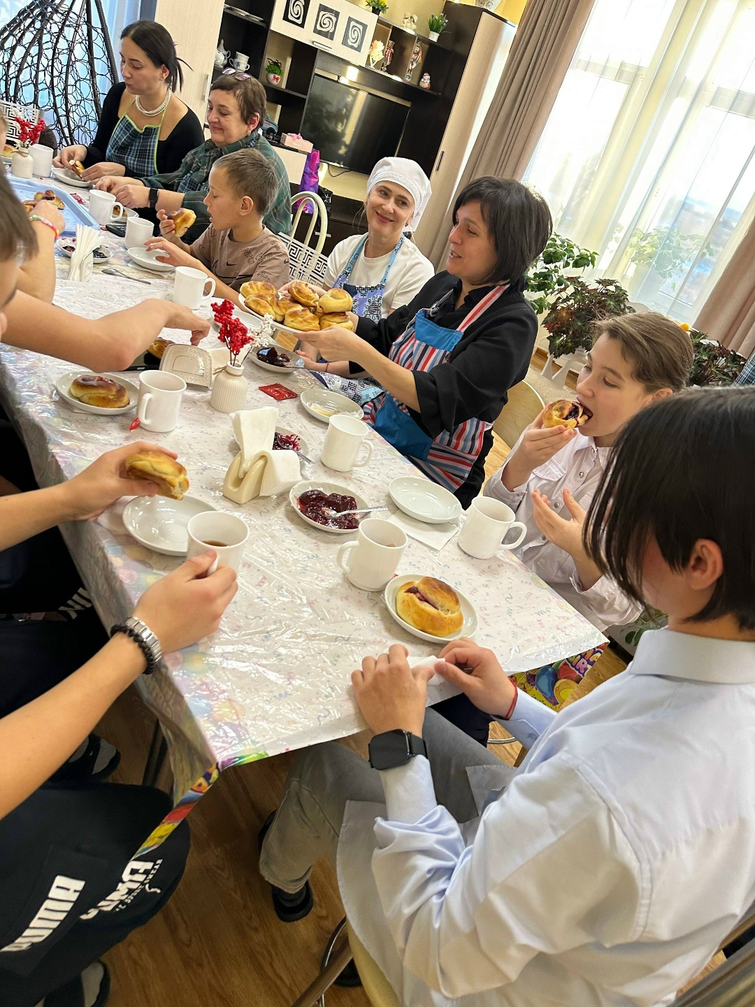 Когда пироги были готовы, все собрались за общим столом на чаепитие. Аромат домашней выпечки создал неповторимую атмосферу доверия и единения. В непринуждённой обстановке участники обсуждали впечатления, делились историями, пели песни и просто радовались моменту.