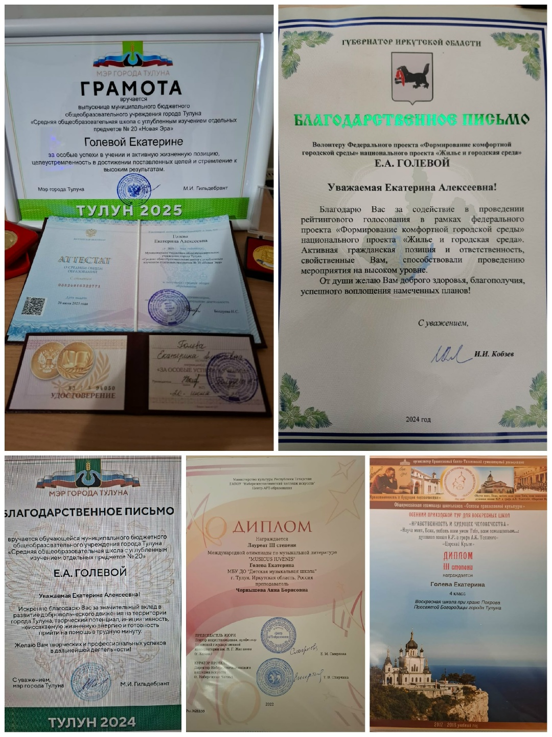 ✴️В общеобразовательной школе Катя всегда училась на отлично. Ежегодно участвовала в предметных олимпиадах, творческих конкурсах. Освоила дополнительную общеразвивающую программу "Агробиология". Получила Золотой знак комплекса ГТО. И школу закончила с золотой медалью! Занесена в Книгу медалистов г. Тулуна. Была приглашена на Губернаторский бал медалистов Иркутской области.