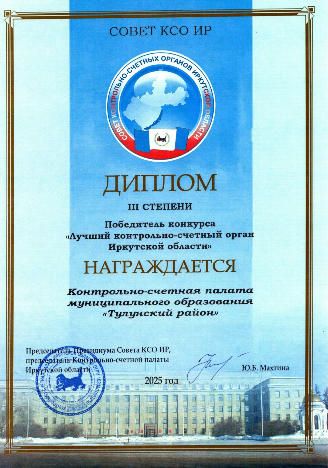 По итогам напряженной борьбы и тщательного анализа показателей Контрольно-счетная палата Тулунского муниципального образования была признана победителем конкурса и удостоена Диплома III степени.