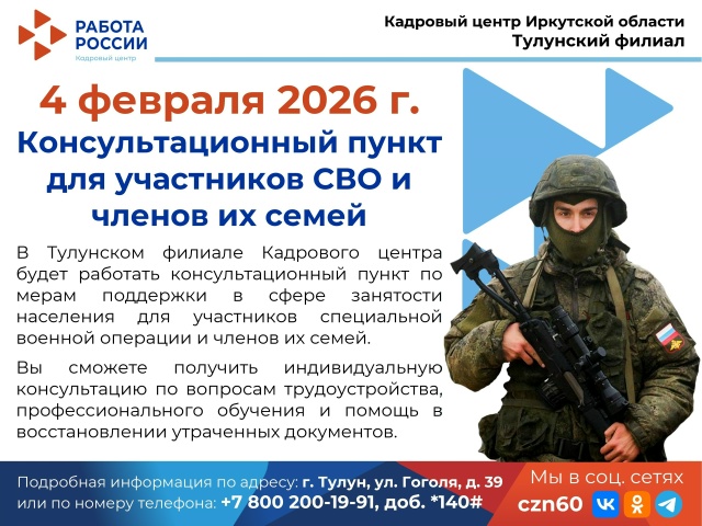 4 февраля 2026 г. с 09:00 до 16:00 в Тулунском филиале Кадрового центра Иркутской области будет работать консультационный пункт по мерам поддержки в сфере занятости населения для участников специальной военной операции и членов их семей.