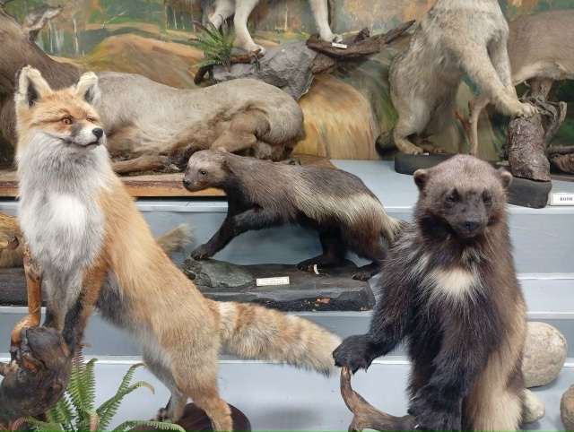 Зал природы. Здесь живут «звери»: чучела лося, медведя, соболя. Но главные звезды — кости шерстистого носорога и череп ископаемого быка. Ледниковый период в центре Тулуна!