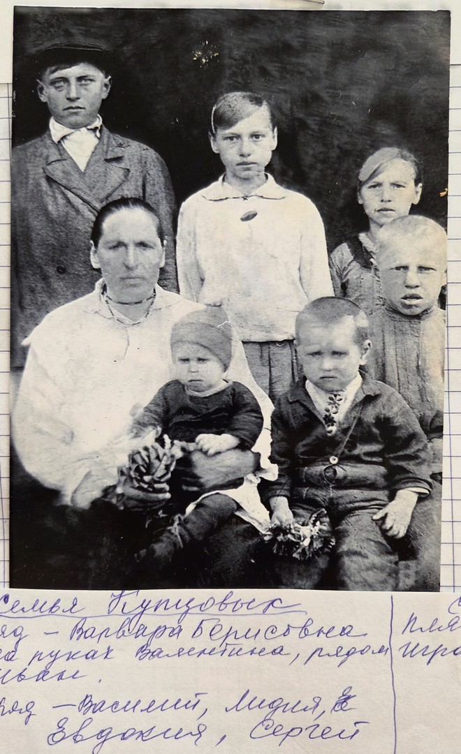 Этот снимок — один из самых старых в семейном альбоме Матюхиных, он сделан в конце 1930-х годов. На нем совсем еще юная Лидия Макаровна со своей мамой Варварой Борисовной Купцовой, братьями и сестрами. Лидия стоит во втором ряду в центре, слева от нее — старший брат Василий (он погиб позже на фронте)