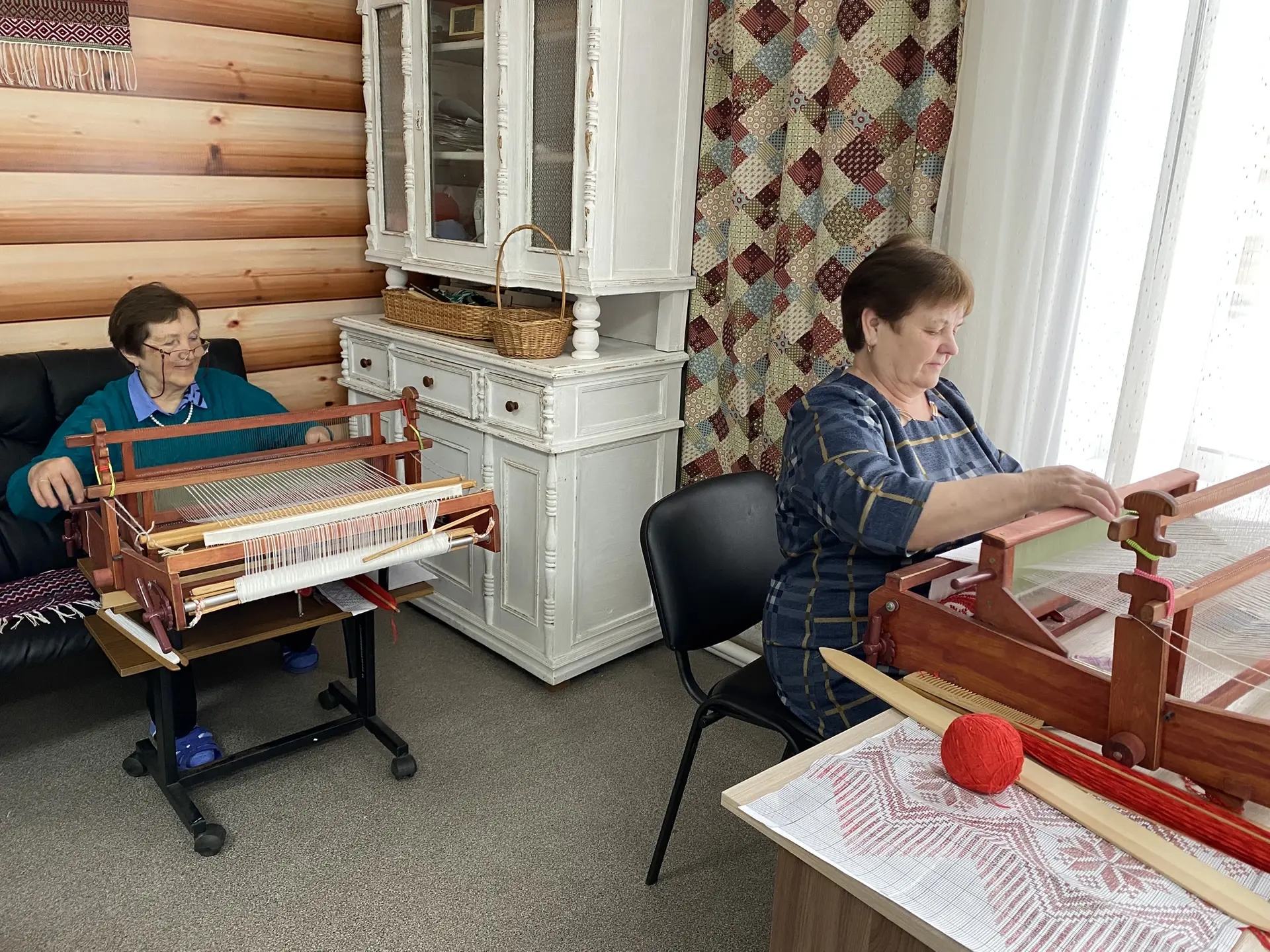 Здесь, под чутким руководством Елены Свешниковой, наши воспитанницы "серебряного возраста" с увлечением осваивают старинное бранное ткачество.